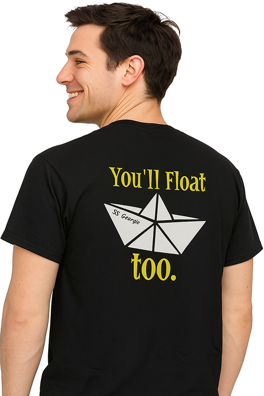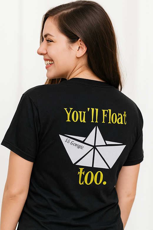 Back Design: A stark white paper boat labeled “SS Georgie” drifts beneath the warning “You’ll float too.” The iconic words send shivers down the spine of any true horror fan.