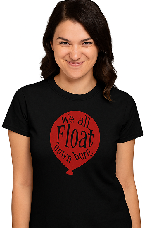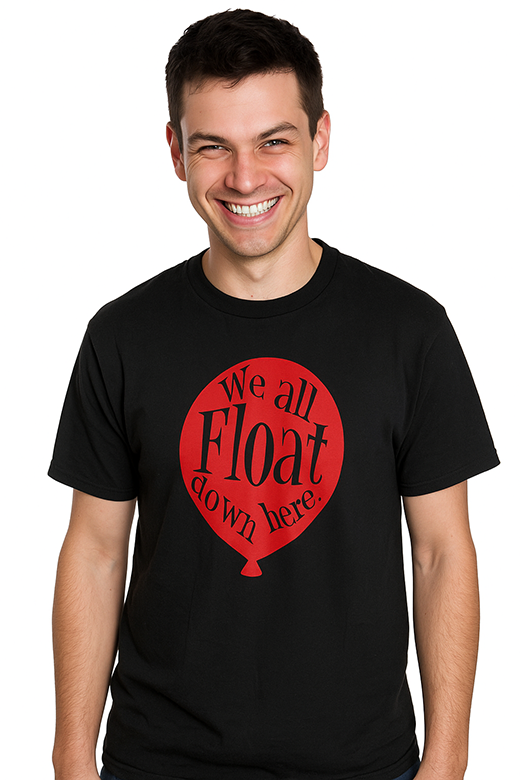 Front Design: A bold red balloon floats at the center, carrying the ominous phrase “We all float down here”—a haunting reminder of Derry’s darkest secret.